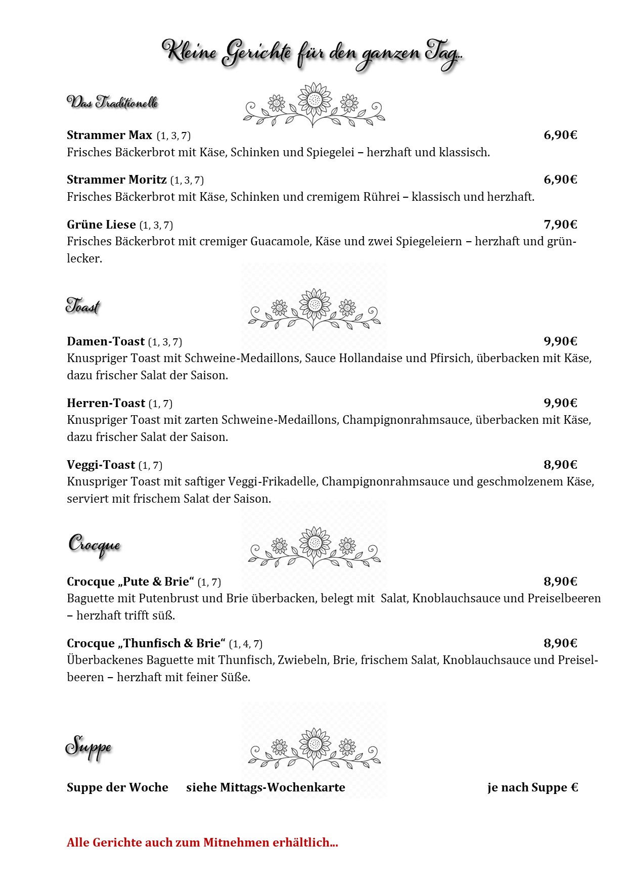 Manchmal braucht es nur einen kleinen Genuss, um den Tag ein bisschen heller zu machen. Unsere kleinen Gerichte gibt es ganztags – frisch, liebevoll zubereitet und immer mit einem Augenzwinkern. Zum Genießen bei uns oder zum Mitnehmen für eine kleine Auszeit unterwegs.Beispieltext. Klicke, um das Textelement auszuwählen.